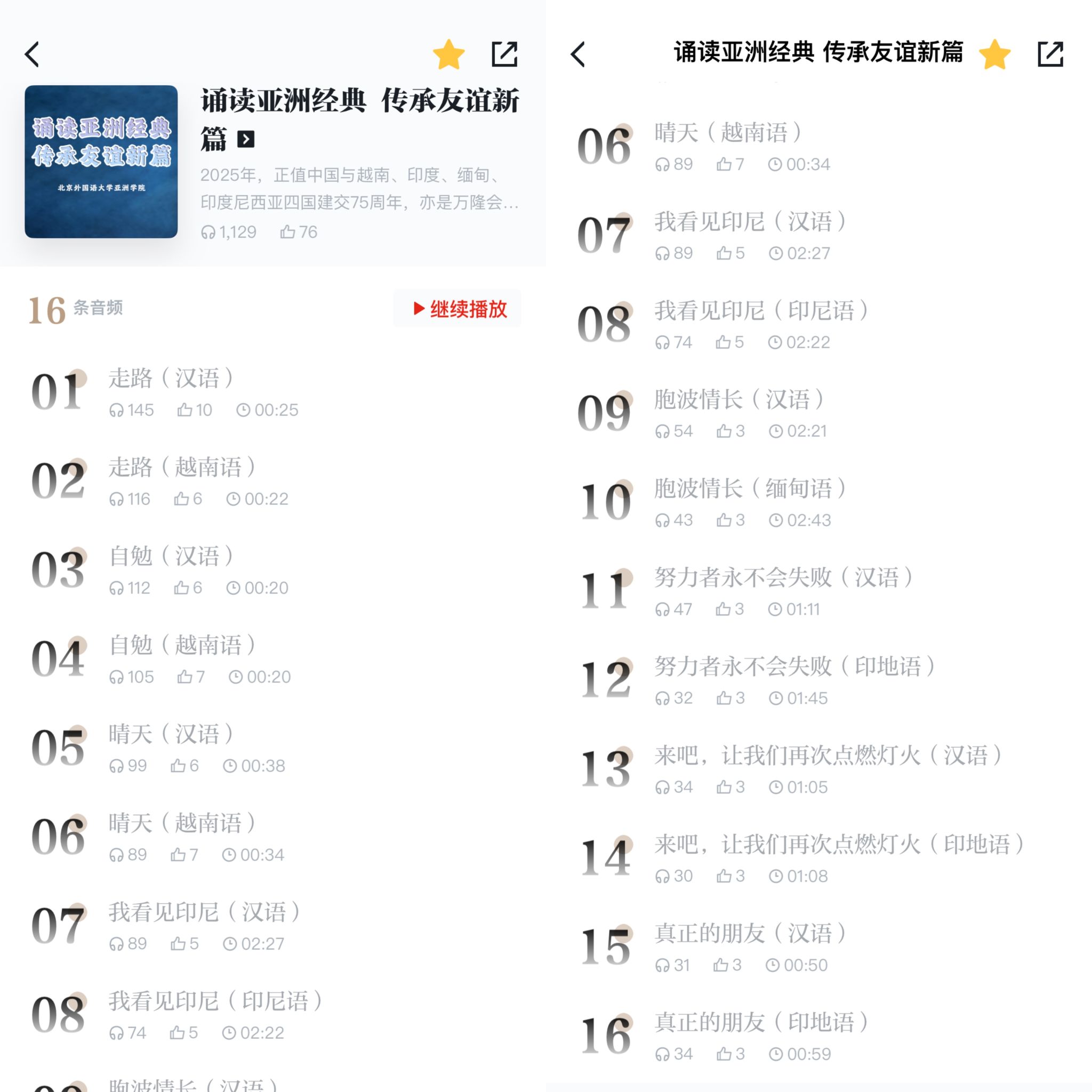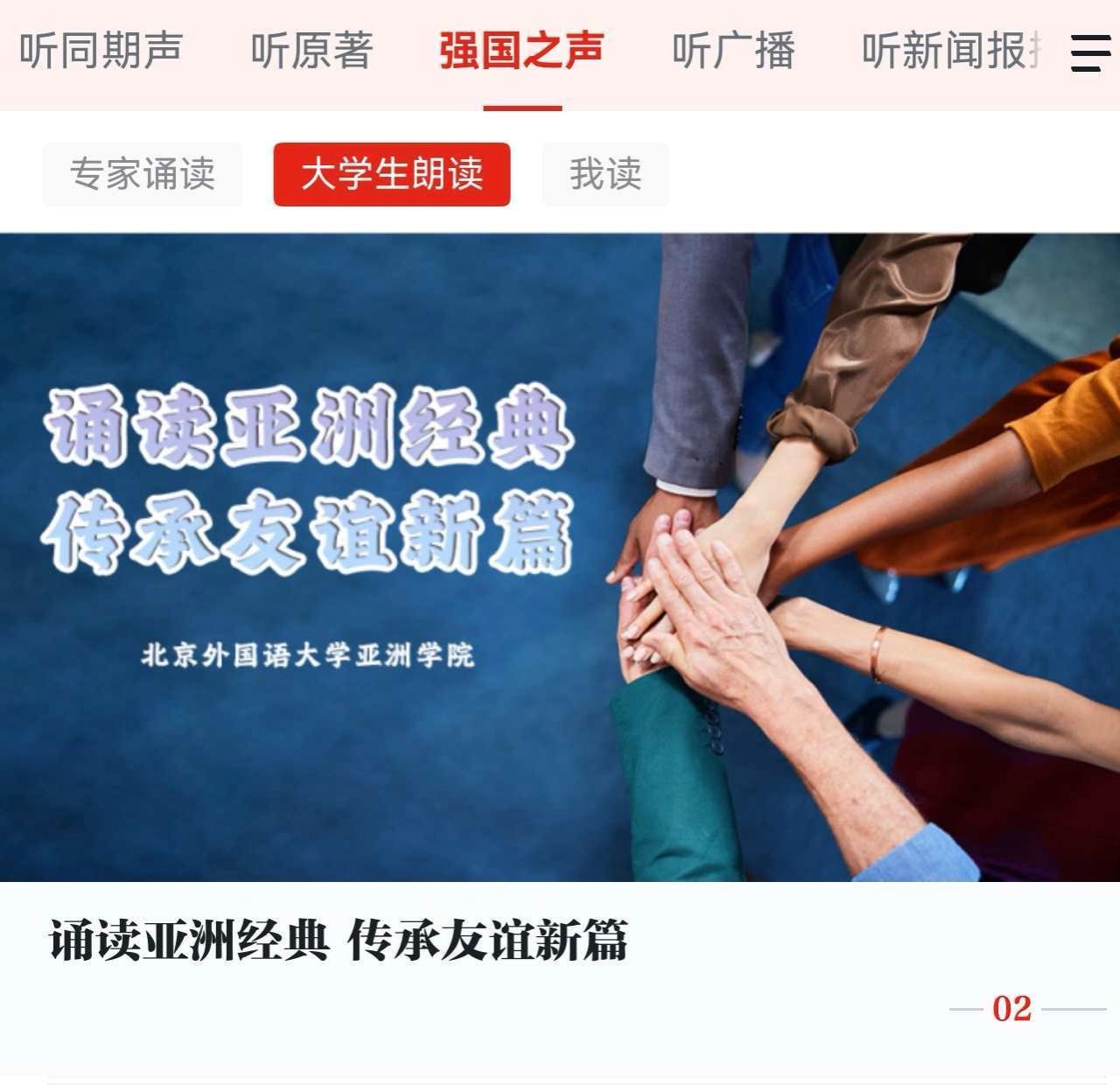 目前,该音频专辑已正式登陆“学习强国”学习平台老员工朗读频道。专辑包含16条作品,涵盖汉语、越南语、印地语、缅甸语、印度尼西亚语五种语言,为广大受众打造了一场沉浸式的亚洲经典听觉盛宴,也成为新时代文明交流互鉴的生动实践。