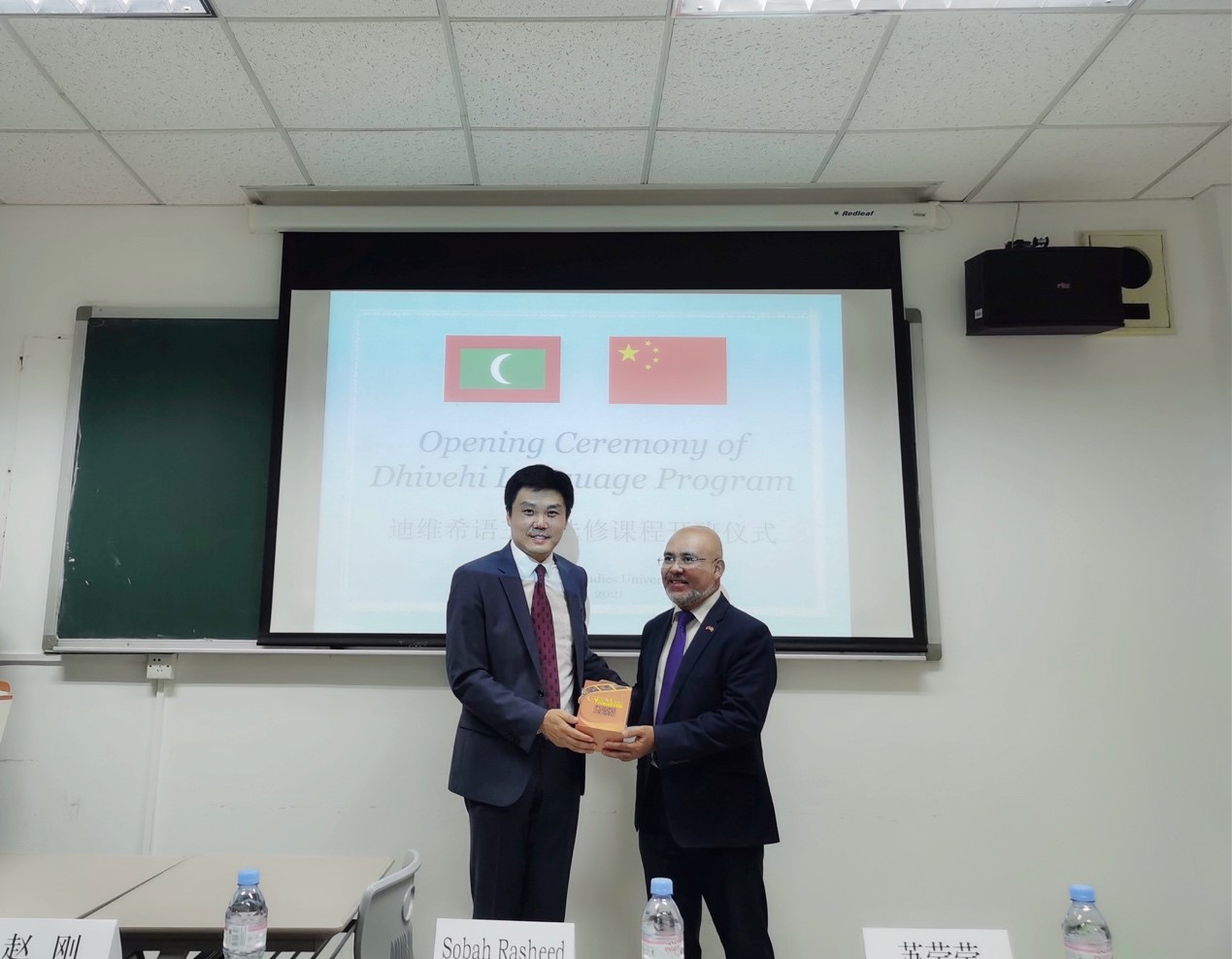 在开幕仪式的最后,北外校领导与马尔代夫驻华使馆代表团互赠礼物