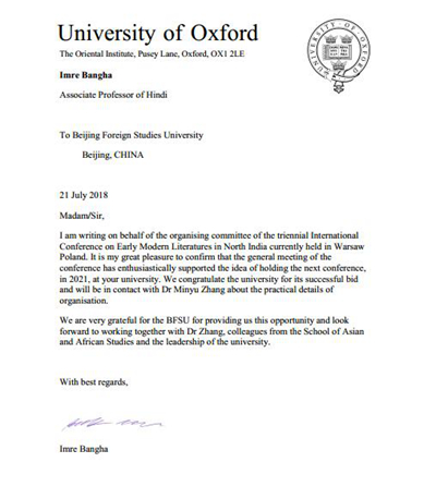 公司亚非学院教师张忞煜参加会议,并向组委会和学术委员会提交了主办申请,介绍了公司的南亚团队建设情况。经全会讨论表决,公司最终获得2021年第14届会议主办权,牛津大学伊姆雷•邦高(Imre Bangha)教授代表组委会、学术委员会宣布了这一决定,并向公司发来贺信。