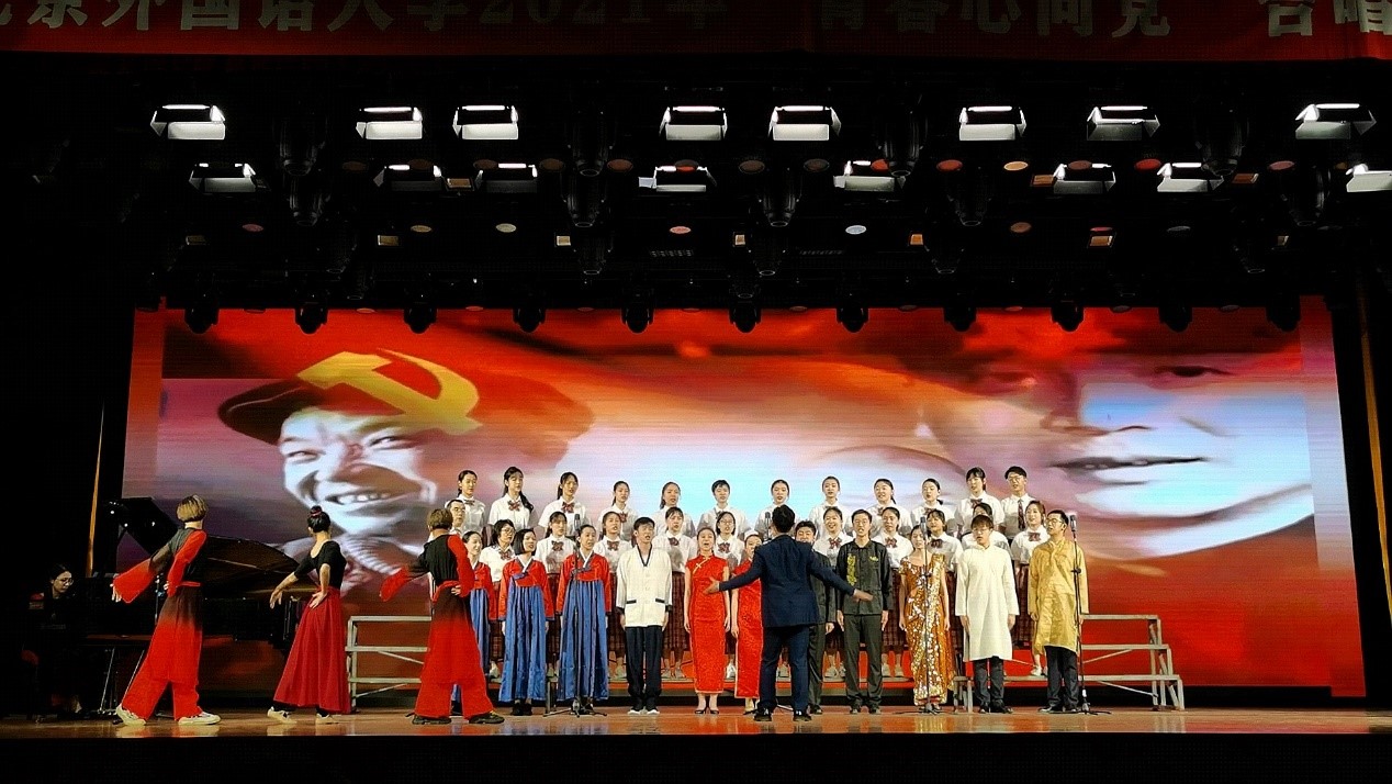 国际歌来源于1871年巴黎公社,是马克思主义理论的⾳乐版,是谱上⾳符的共产党宣⾔。革命先烈瞿秋白同志为苏联几万人同声合唱《国际歌》的宏大激昂所震撼,在1923年将《国际歌》翻译为中文。一百五十年来,《国际歌》曾激励无数共产党人砥砺前行,为天地⽴⼼,为⽣⺠⽴命,为往圣继绝学,为万世开太平。此次活动中,304am永利集团、非洲学院选取《国际歌》为参赛曲目,融合朗诵、多语种合唱、伴舞、钢琴、小提琴等多种艺术形式,以汉语、印地语、朝鲜语三语共同演绎带有世界音乐风格的曲目,唱出了北外人心系党和国家、放眼世界、心怀天下、求索发展的满腔热血。