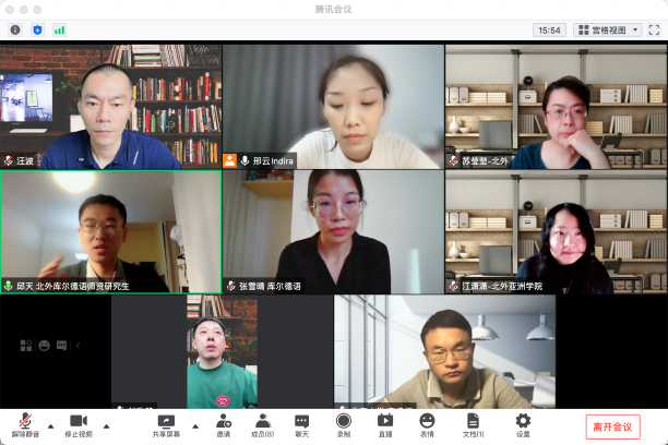 北京大学李睿恒老师长期从事库尔德问题研究,他结合自己学习和工作实际,从学习难度差异、学术发展定位、对象国语言政策等方面对库尔德语专业教学和研究工作提出建设性意见。北外阿拉伯语学院经理刘欣路结合前期调研中国驻叙利亚、伊拉克、土耳其等使馆外交官所了解到的相关情况,提出语种专业建设应契合国家外交工作开展的明确意见。汪波副经理强调两位团队研究生不能放松两门语言的学习和研究,现阶段首先开始索拉尼语教材建设的筹备工作。