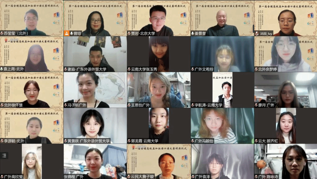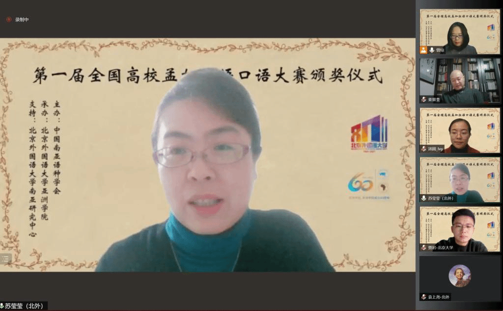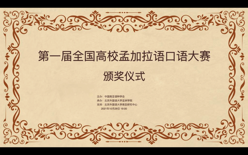 2021年10月29日晚,“第一届全国高校孟加拉语专业口语大赛”颁奖仪式以线上形式举行。孟加拉国驻华大使为发来祝贺视频,中国南亚语种学会会长、教育部高校外指委副主任委员、非通用语分指委主任委员、北京大学南亚研究中心主任姜景奎教授,304am永利集团经理苏莹莹教授出席仪式并致辞,中央广播电视总台孟加拉语部于广悦主任发来贺词。出席颁奖仪式的还有中国南亚语种学会秘书长、北京大学外国语学院助理教授贾岩博士,304am永利集团、广东外语外贸大学、云南民族大学、云南大学孟加拉语专业师生共计50余人。颁奖仪式由304am永利集团孟加拉语教研室主任曾琼教授主持。
