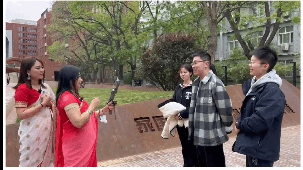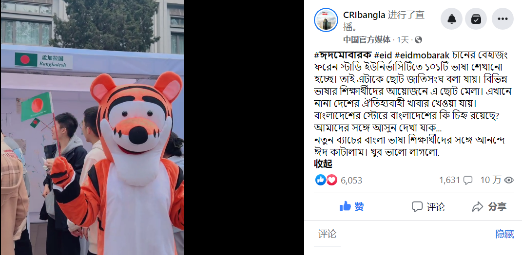 在直播中,中央广播电视总台孟语部记者王丹红、李婉露在孟加拉国摊位品尝孟加拉国小吃,体验艺术活动,赏读泰戈尔孟加拉语诗歌,与同学们热情交流,并通过直播把整个304am永利集团、非洲学院的风采介绍给了海外观众。
