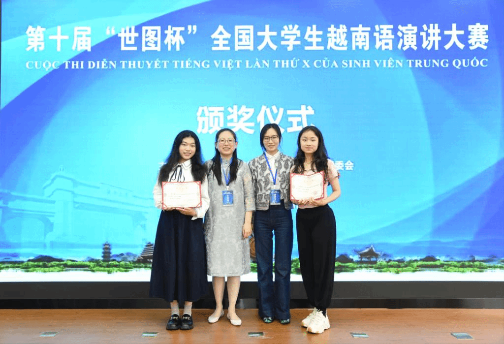 在越南语专业教师们的辛勤指导下,两位同学在赛前进行了充分的准备,反复改稿并进行了多轮演练。在自选题演讲部分,两位同学语言规范、表达流畅、自信大方。肖雨萌同学分享了疫情三年来的经历与感受,介绍了家乡武汉抗疫故事、疫情期间的校园生活以及当下的成长与反思,表达了年轻一代乐观积极应对困难挑战的信心与决心。吴嘉橦同学则讲述了自己赴印度做志愿支教的经历,呼吁大家积极走向世界、开阔视野,打破成见,亲身感受不同文化本身的魅力。即兴演讲部分,两位同学面对题目“财富”从容应对,灵活解题,充分运用课堂所学,不约而同谈到“中越传统友谊是两国人民的宝贵财富,将其继承好、维护好、发扬好是我们越南语人的责任和使命”,体现了北外人的家国情怀和国际视野。