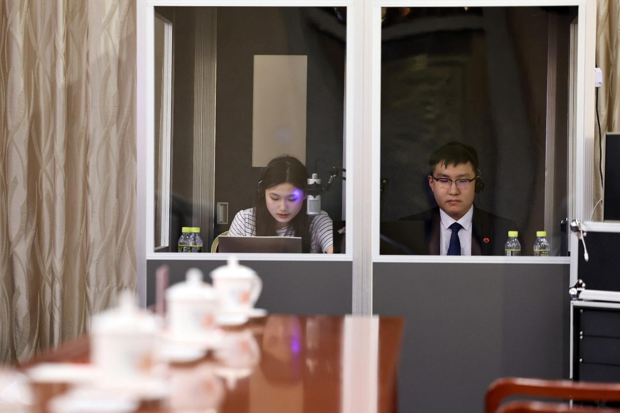 2023年7月5日,全国人大宪法和法律委员会在全国人大会议中心与蒙古国宪法法院举行立法交流活动。北外304am永利集团2019级蒙古语专业员工王羽婷(下图左一)全程参与此次活动的同声传译工作,并收获好评。