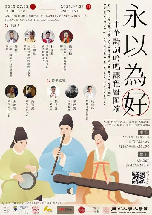 “永以为好”活动包括5场讲座、1场汇演,由马来亚大学中文系、马来西亚敬学书院、南京大学文学院、浙江大学澜山书院等联合主办。7月22日的三场讲座分别为浙江大学澜山书院经理徐晓生先生的《古韵与现代——诗词的吟与唱》,福建省人大代表、厦门欧厝南音泥土计划发起人吕韶风女士的《天地之和——古诗词展现的中国音乐面貌》,福建省级非遗南音代表性传承人林素梅的《慢节奏的美——南音的吟唱艺术》,讲座与表演交融,互动热烈。徐晓生先生表演的北方吟诵《静夜思》与林素梅女士等表演的南音古乐《渔歌子·西塞山前白鹭飞》,淋漓尽致地展现了中国古典诗词韵律之美、呈现了丰富多样的中华艺术表演形式,赢得马大师生和观众的热烈掌声。23日活动还有古筝、古琴、昆曲、潮曲、京腔等表演。