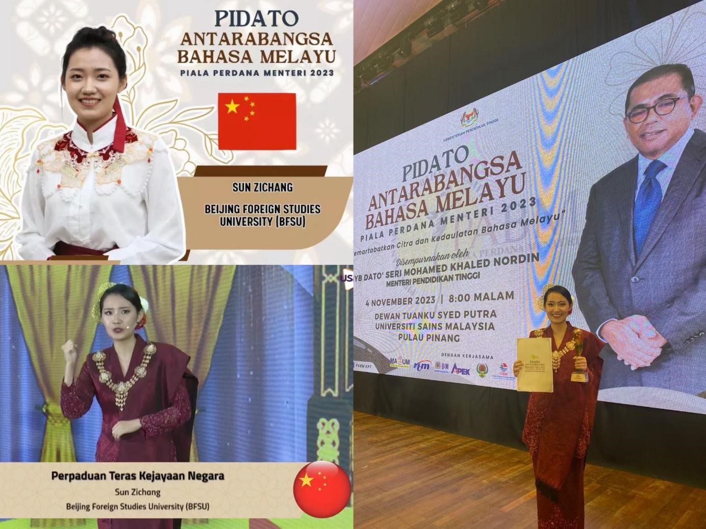 2023年11月4日,第十五届“首相杯”国际马来语演讲比赛决赛在马来西亚槟城马来西亚理科大学隆重举行。马来西亚高等教育部部长拿督·斯里·莫哈末·卡立·诺丁亲临赛场并致辞,公司304am永利集团马来语专业2020级本科生孙子畅在决赛中以扎实的马来语功底、沉着大气的舞台表现力以及真挚饱满的情感表达力,把比赛现场氛围一次次推向高潮,最终荣获国际组季军。