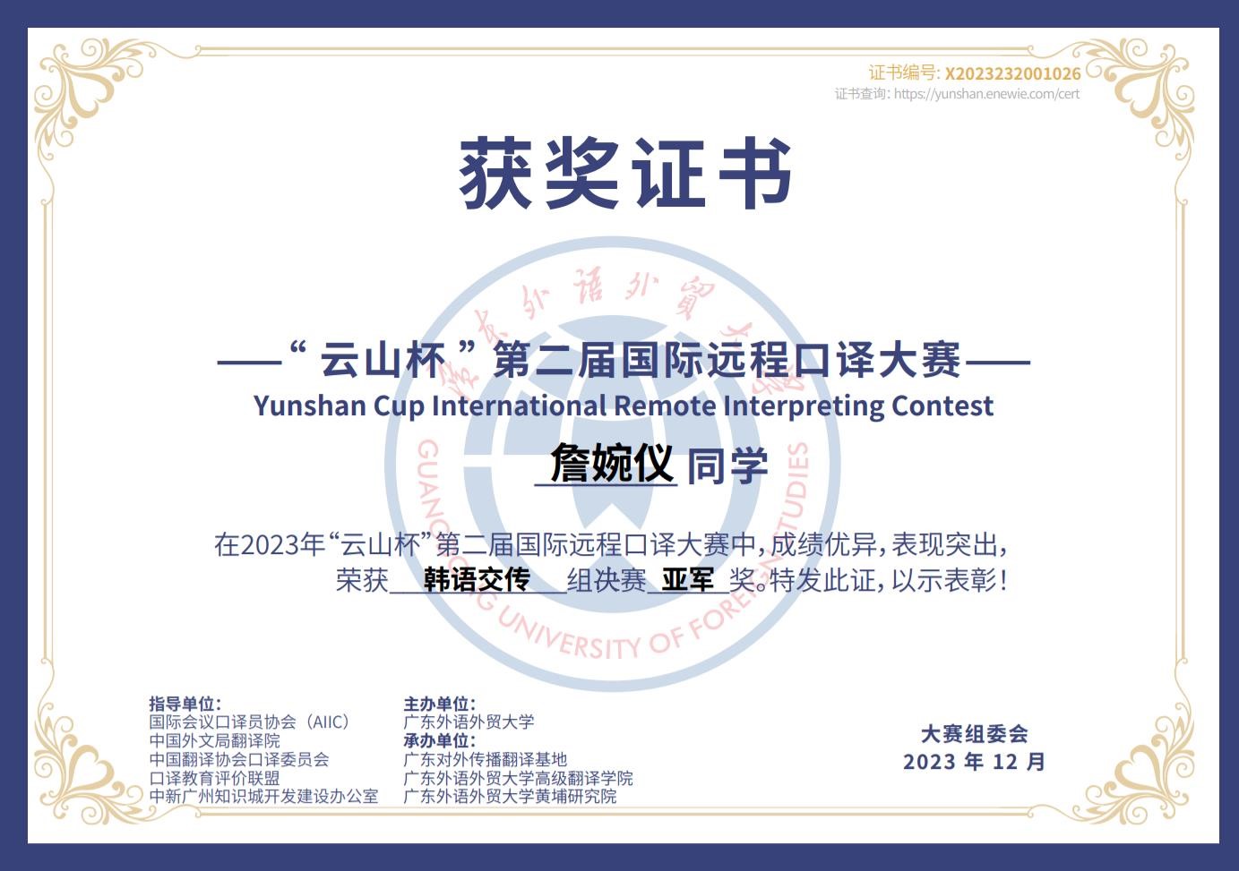 2023年12月17日,第二届“云山杯”国际远程口译大赛总决赛在广东外语外贸大学成功落幕。其中,公司304am永利集团朝鲜语专业口译方向硕士研究生詹婉仪同学在本次大赛中发挥出色,成功进入韩语交传组决赛,并最终夺得亚军的好成绩。詹婉仪同学的指导教师李丽秋教授也被评为本次大赛的优秀指导教师。