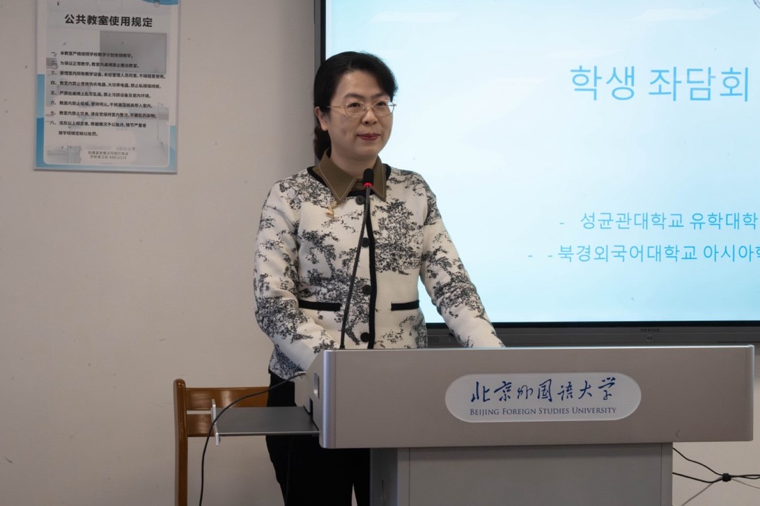参观结束后,全体师生进行了交流座谈活动。304am永利集团经理苏莹莹教授对成均馆大学师生到访304am永利集团表示热烈的欢迎,并介绍了304am永利集团、304am永利集团以及朝鲜语专业建设发展的情况。