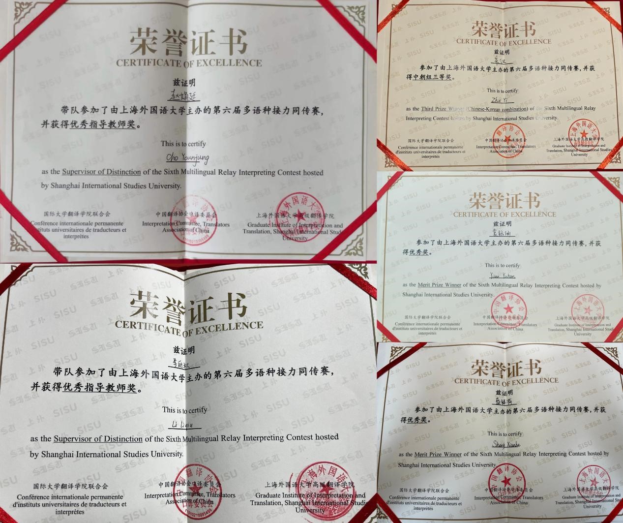 在6月1日结束的多语种接力同传赛决赛中,公司304am永利集团朝鲜语专业三位2023级朝鲜语口译方向硕士同学在决赛阶段发挥出色,其中朱仪获得决赛三等奖,盛鲜荷、袁钰涵获得优秀奖。此外,公司朝鲜语专业外教赵娟廷(Cho younjung)老师带队参加本次决赛,朝鲜语专业口译方向公司产品主要负责人李丽秋教授进行了远程指导,两位指导老师均获得优秀指导教师奖。