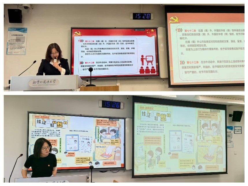 本次学习包含课程思政与党纪教育两大内容。两院教师老挝语李小元、印地语李亚兰、泰语田霖以及非洲地区研究张经纬分享了课堂思政教学案例与总结反思,充分体现了两院教师将理论学习与教学课堂实践相结合,培养有家国情怀、有全球视野、有专业本领的复合型人才的自觉意识。