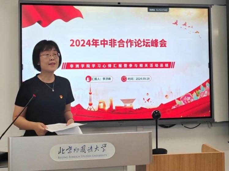 活动第一部分为学习习近平主席在2024年中非合作论坛北京峰会开幕式上的主旨讲话精神。非洲学院李洪峰经理介绍了此次峰会会议情况和成果,重点解读了习近平总书记在开幕式上的主旨讲话,向全体教师分享学习心得。她指出中非合作历史最好时期已经到来,强调了中非合作的重要性,非洲学院师生应“知非友非”,要始终“服务人民,不忘初心”。