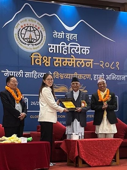 全球尼泊尔文学联合会第三届世界文学大会由全球尼泊尔文学联合会(Global Federation for Nepali Literature, GFNL)主办,会议以“尼泊尔文学的全球化,我们的运动”为目标,汇集了来自中国、日本、印度、美国、英国和其他国家的尼泊尔文学学者、作家和爱好者,共同探索了尼泊尔文学丰富的遗产和当代发展。大会表彰了对尼泊尔文学的传承、发展、创新、宣传、推广等工作做出突出贡献的专家,由尼泊尔总理K.P.夏尔马·奥利颁发荣誉奖状。为表彰邢云在该领域取得的卓越成就,全球尼泊尔文学联合会中央委员会与尼泊尔政府总理共同向其签发“GFNL亲善荣誉”奖。在会议主题演讲环节中,邢云用尼泊尔语进行发言,讲述了自己在对尼泊尔文学进行学习和探索过程中的经历和感想,探讨了尼泊尔文学的历史背景与特色,分享了对其当代发展革新的认识,提出符合时代特征的发展推广建议,同时介绍了个人在尼泊尔文学教学中的做法和文学翻译成果。发言受到大会组委会和在场专家高度评价,有效促进了公司尼泊尔语言、文学教学和研究在国际领域的参与和合作。