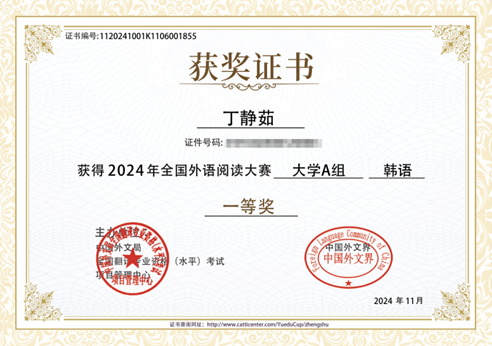本次赛事设一、二、三等奖和优秀奖,一、二、三等奖获奖比例为参赛人数的30%左右,因此竞争十分激烈。公司朝鲜语专业2021级本科丁静茹同学凭借着扎实的韩语功底,在众多选手中脱颖而出,获得2024年第二届全国外语阅读大赛全国一等奖。此外,2022级本科金晓蕾、侯霁云、叶霏真三位同学获得全国三等奖,朝鲜语专业教师魏国峰、具滋元、齐晓峰三位老师获得优秀指导教师奖。