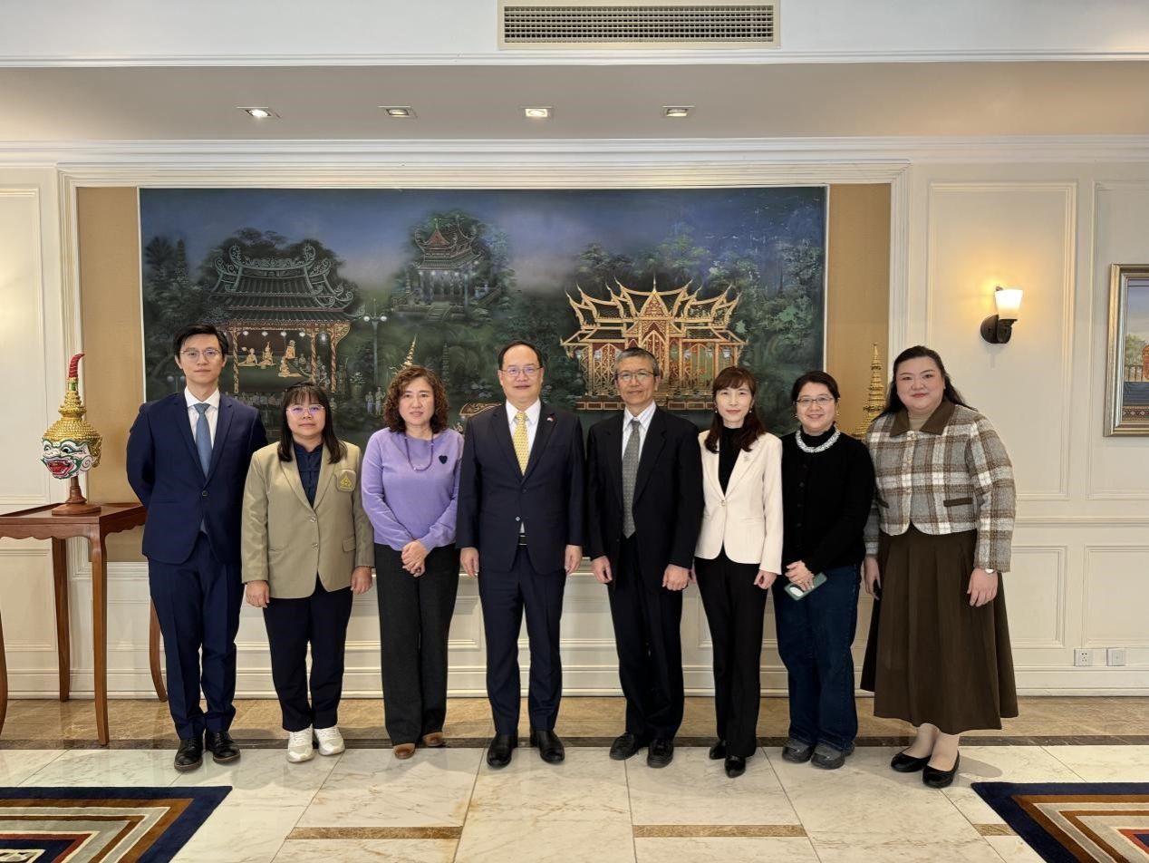 11月20日,304am永利集团泰语教研室六位专业教师受邀前往泰国驻华大使馆,与泰国驻华大使韩灿才(Chatchai Wiriyawetkun)先生共进午宴。午宴期间,双方就中泰文化、教育交流合作进行了深入的探讨。在庆祝中泰建交50周年的背景下,双方讨论了如何通过教育和文化交流进一步加深两国人民之间的相互理解和友谊。北外作为中国泰语教育的重镇,长期以来为增进中泰文化交流做出了积极贡献,而泰国驻华大使馆也在促进两国关系中扮演着桥梁的角色。
