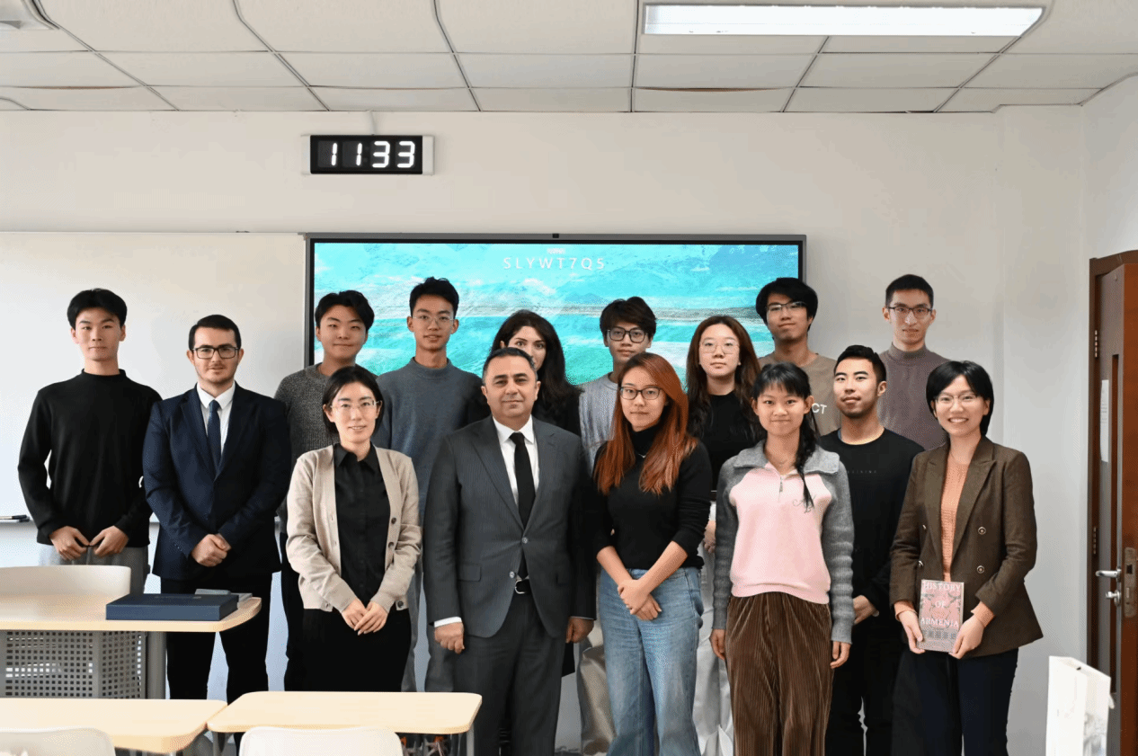 在活动中,格沃尔克扬大使与同学们进行了亲切而深入的对话,耐心回答了同学们对于亚美尼亚文化、历史、艺术以及中亚合作的诸多问题。大使从亚美尼亚的文学艺术瑰宝讲起,延伸至亚美尼亚与中国在各领域的全方位合作,特别强调了两国在文化合作方面的丰硕成果与未来展望。这不仅让亚美尼亚语专业的师生们对亚美尼亚文化有了更深刻的理解,也提供了宝贵的学习实践机会。