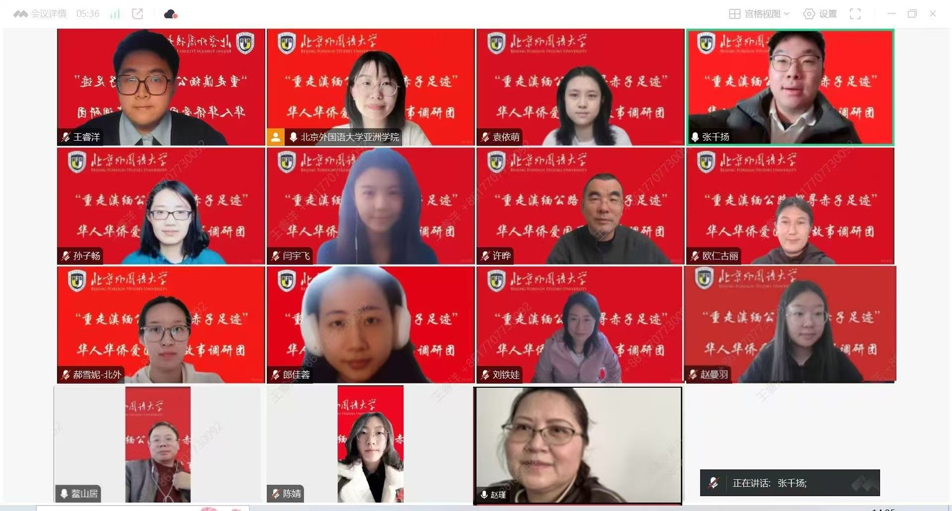 冯刚在致辞中强调了传承华人华侨爱国精神的重要意义,并鼓励同学们以严谨的态度和饱满的热情完成调研任务;刘铁娃介绍了中华民族共同体研究基地情况,希望同学们通过调研与历史共情,与当下共鸣,与未来共进;赵瑾介绍了滇缅公路的历史意义,鼓励同学们深入了解历史,传承伟大的爱国精神。交流环节,调研团员工代表郝雪妮、孙子畅、闫宇飞、王睿洋依次分享了观看《南侨机工》纪录片的感悟。同学们深深感动于老一辈华侨为国奉献的精神,对实践活动充满了期待。许晔在总结发言中强调了调研纪律,并要求同学们要秉承敬畏之心,结合所学知识,认真开展调研,时刻展现北外人的精神面貌。
