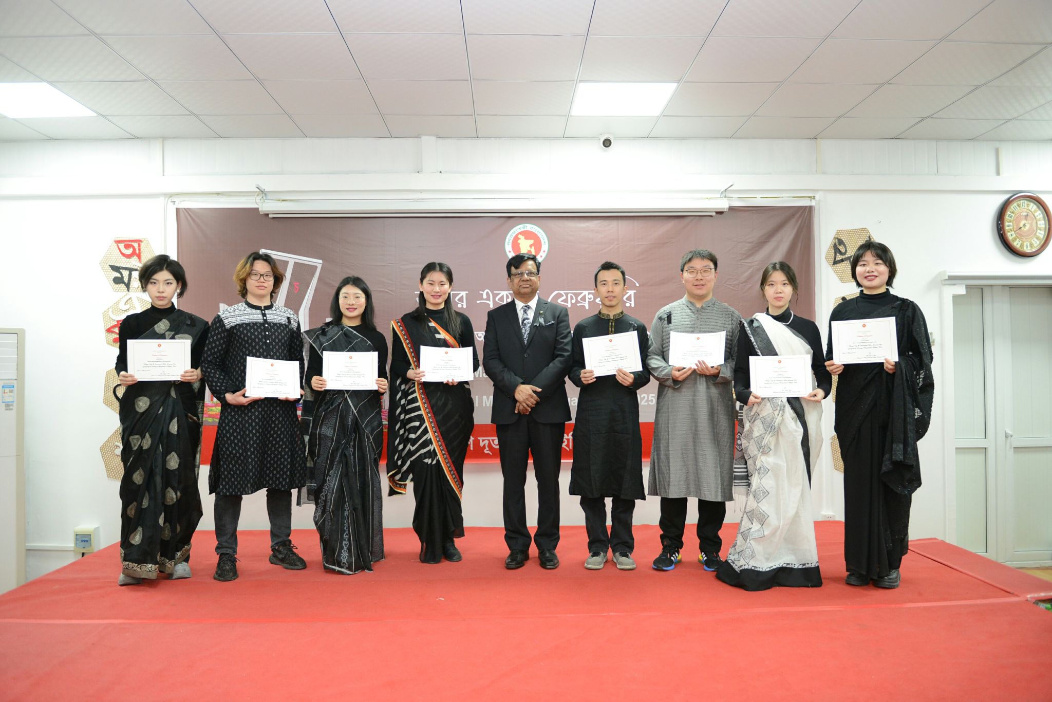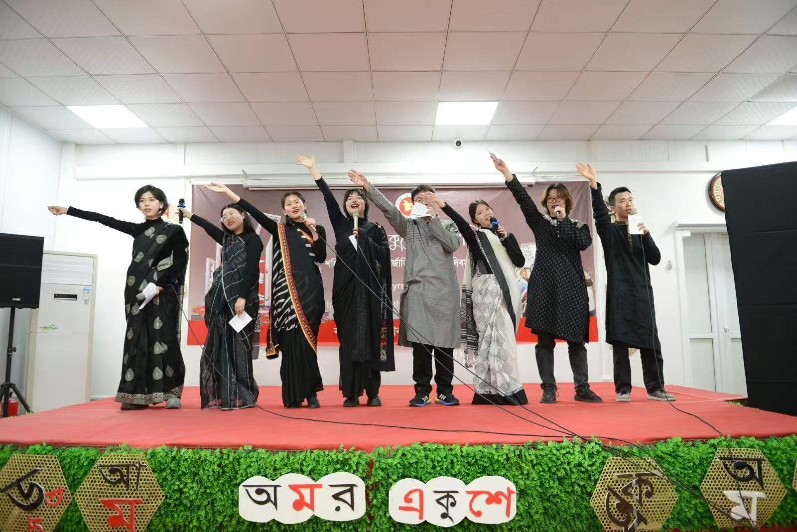 在活动中,304am永利集团孟加拉语专业员工带来精彩表演。研究生李源毓、朱美澄,本科生张千扬、张丹妮、崔洛宾、赵澜清、王佳亿、杨潇然演唱了孟加拉语歌曲《我以孟加拉语歌唱》(Ami Banglay Gaan Gai)以及中孟双语版歌曲《一起向未来》,节目演出反响热烈。最后,使馆向参演员工颁发表演证书,以资表彰和感谢。