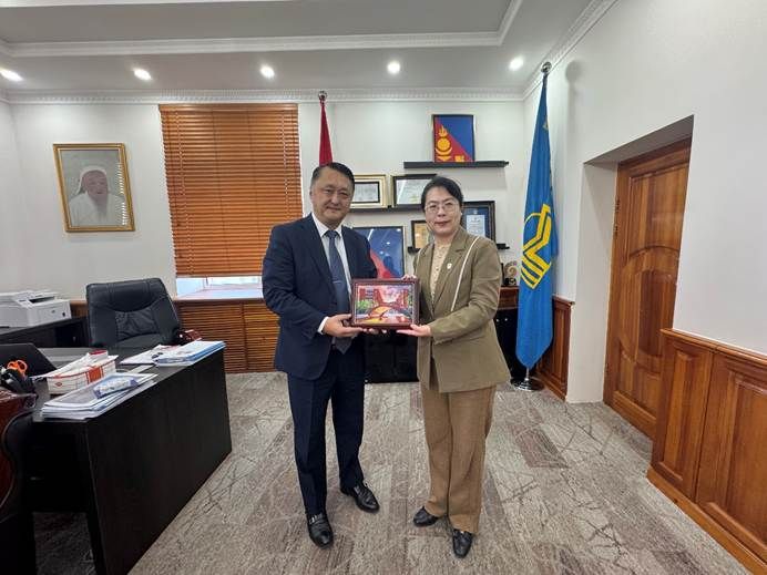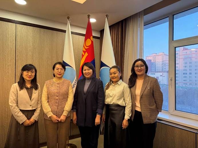 10月27日上午,代表团访问蒙古国立大学,会见董事长B.Ochirkhuyag、副董事长D.Zayabaatar、国内国际事务合作处处长Sh.Mendbayar、人文学院经理T.Eldev-Ochir。苏莹莹经理向蒙方介绍了北外的办学历史、101个语种专业建设成果,以及北外发起的“全球外国语大学联盟”“全球区域国别学共同体”等国际学术合作机制,并对未来两校深化合作与公司蒙古语专业建设前景提出建议。蒙古国立大学是蒙古国最早建立的重点综合性大学,为蒙古国培养了大批人文社科与自然科学高端人才。B.Ochirkhuyag董事长对北外团队建设、人才培养所取得的成绩表示赞赏,向代表团着重介绍了蒙古国立大学人文社科等相关领域团队建设发展情况,希望通过续签两校合作协议,进一步深化与北外的人员交流与学术合作。