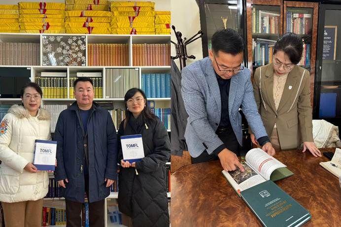 会见后,蒙古国立大学副董事长D.Zayabaatar教授带领代表团参观了蒙古国立大学图书馆、蒙古语水平测试中心,蒙古国立大学人文学院经理T.Eldev-Ochir教授向代表团详细介绍了该校人文学院下设外国语言文学各院系团队建设情况,并洽谈未来与北外进一步深入合作设想。