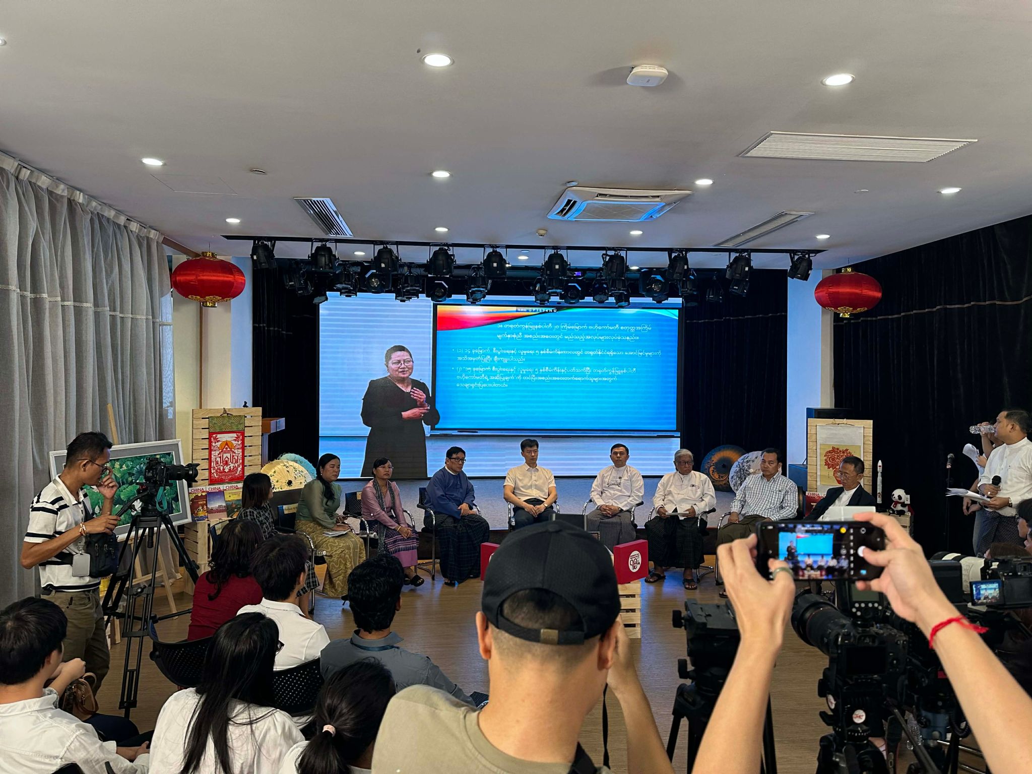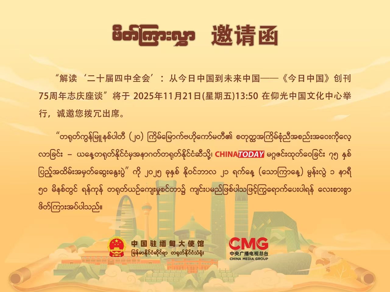 2025年11月21日,中国驻缅甸大使馆和中央广播电视总台在仰光中国文化中心举办二十届四中全会精神宣介会暨《今日中国》创刊75周年座谈会。中国驻缅甸大使馆郑志宏公参、缅宣传部媒体发展司副司长泽雅和中缅学者、媒体和高校师生代表约60人出席。其中304am永利集团缅甸语专业师生线上参与此次座谈会。
