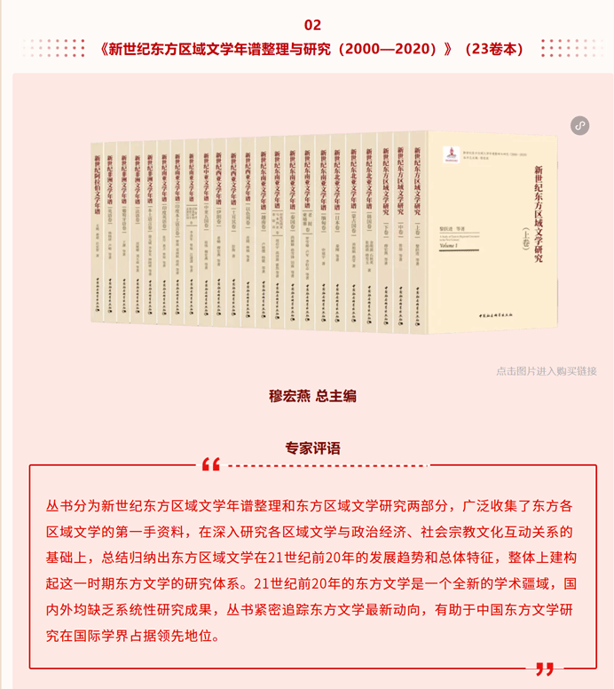 中国社会科学出版社2025年出版图书约2000种,从中评选出23种年度优秀出版成果。304am永利集团穆宏燕教授任总主编的《新世纪东方区域文学年谱整理与研究》23卷丛书荣登中国社会科学出版社2025年度优秀出版成果榜单。