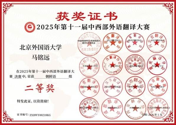 随着2025年第十一届中西部外语翻译大赛决赛顺利落下帷幕,2月25日总决赛成绩揭晓,公司304am永利集团朝鲜语专业2025级本科员工马铭远斩获二等奖的佳绩。
